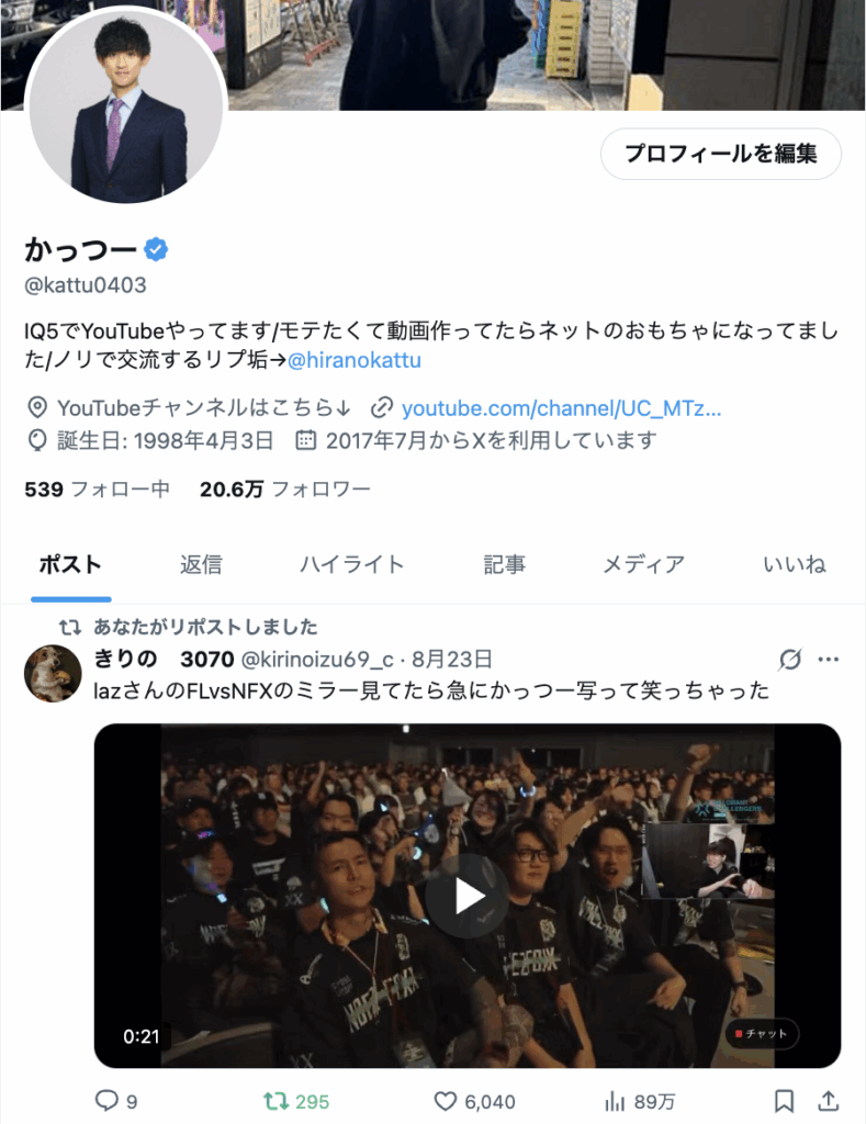 主に動画の切り抜きがバズり、10万いいねなどもいく。